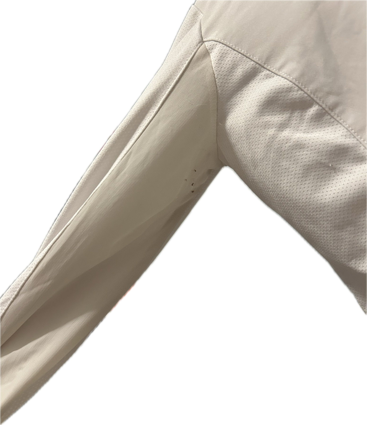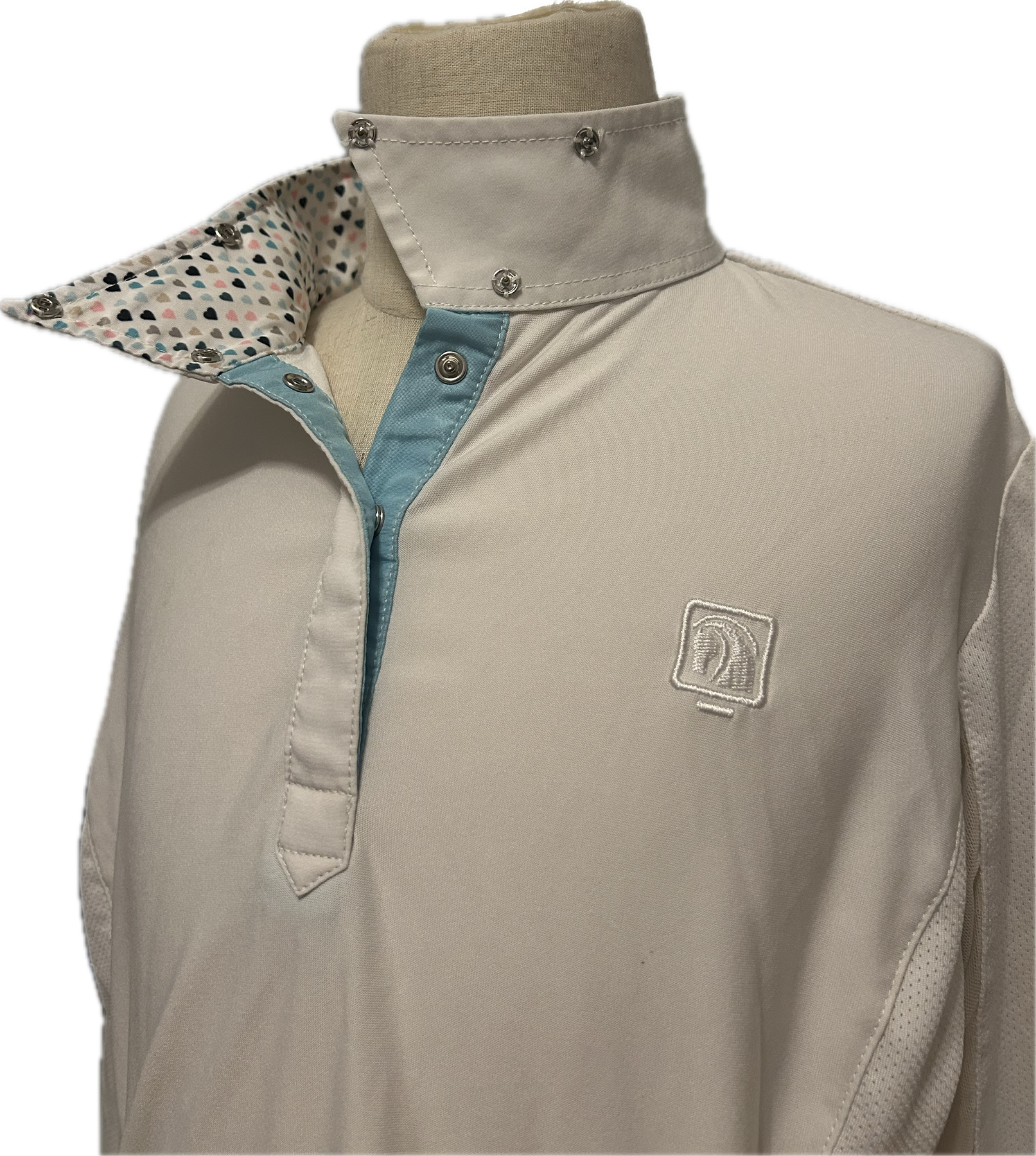 The classic white show-ring exterior gives a clean, polished look under a show coat, while the hidden details make it fun and unique — a playful multi-colored hearts print inside the collar and placket adds just the right touch of personality. When the coat comes off, the colorful inner print shines through, showing off your rider’s cheerful side.