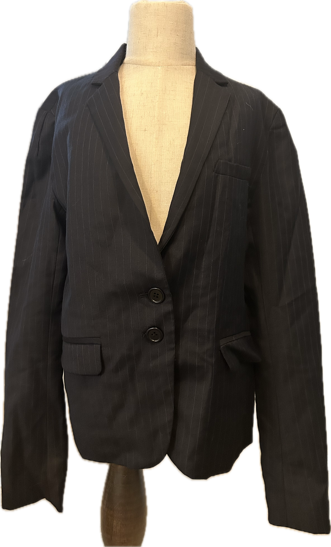 A timeless black pinstripe blazer from Crewcuts by J.Crew, crafted from a stretch wool blend for comfort and ease of movement. The interior features a playful polka dot lining that adds a subtle touch of personality to this classic piece. Designed with a notched lapel, two-button front closure, and functional pockets, it balances style and practicality. A single back vent ensures a comfortable fit, while the soft cotton lining enhances overall quality. Perfect for special occasions, school events, or formal gatherings, this blazer combines elegance, structure, and a hint of fun.
