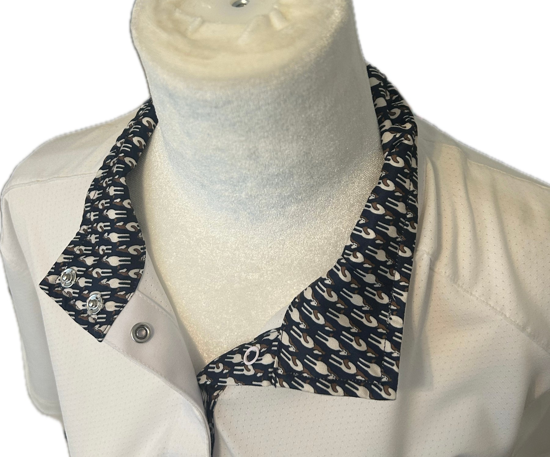Elevate your show ring style with the Essex Classics Talent Yarn® Short Sleeve Show Shirt, designed for both comfort and performance. This classic straight-collar shirt features the iconic “Looking Back” horse pattern subtly woven into the collar and interior trim, adding a touch of equestrian elegance that peeks through with every move.