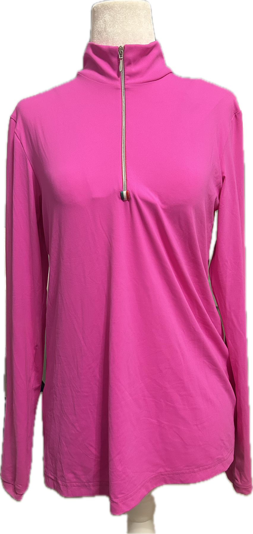 The four-way stretch material offers full freedom of movement, while the silky-smooth texture feels soft against the skin. Its tailored silhouette flatters the rider’s figure, featuring a feminine quarter-zip front and refined stand collar for a polished, athletic look. The Pink Mania shade adds a vibrant, modern touch to your equestrian wardrobe—perfect for riders who love performance gear with personality.