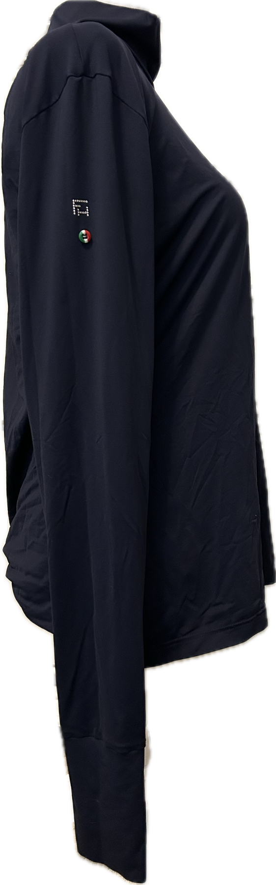 A high-performance long sleeve riding shirt designed for comfort and sun protection. Made from lightweight, breathable microfiber with UV protection, it features a mock turtleneck and thumbhole sleeves for extended coverage and freedom of movement. Perfect for training, schooling, or layering under show jackets, with a sleek, athletic fit that moves with you.